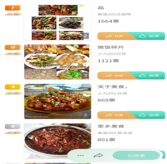 此次活动由公司员工会学习部主办,通过各班班委宣传,将此活动的内容及目的给班上同学传达到位,所有作品需符合健康文明,积极向上的观念,采用微信小程序线上投票。经过参赛选手一番精心挑选后,各类菜品也都纷纷投稿上线,而富有寓意的菜名都无不显示着参赛选手们必胜的决心,展示了同学们别具一格的厨艺,各位评委和观众看着屏幕里的作品,彷佛屏幕里面弥漫出诱人的香味。截止目前,活动共有57人投稿,浏览量达2万多!评比中,根据赛制40%线上投票结果和60%老师评审结果,最终评选出一等奖一名(文秘212降央拉姆),二等奖一名(英语202文丽琴),三等奖四名(人力202付芳、人力202杜菲、英语202陈汝佳、旅游212王思丹)。