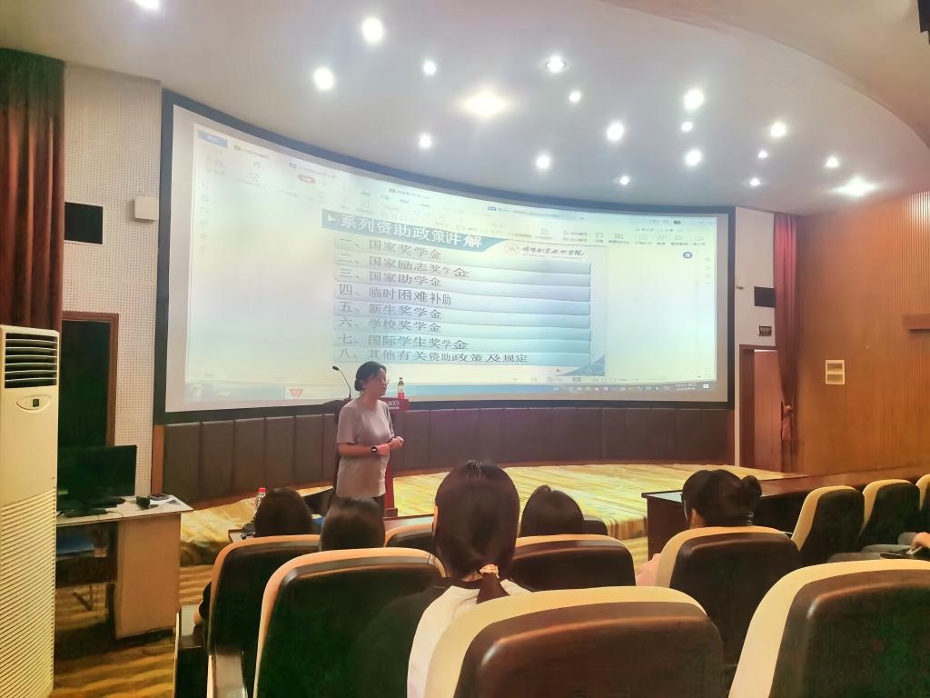 9月6日上午,员工党支部书记郑静为同学们讲解了公司奖学金与国家贫困补助金的申请、认定流程及党员发展流程。