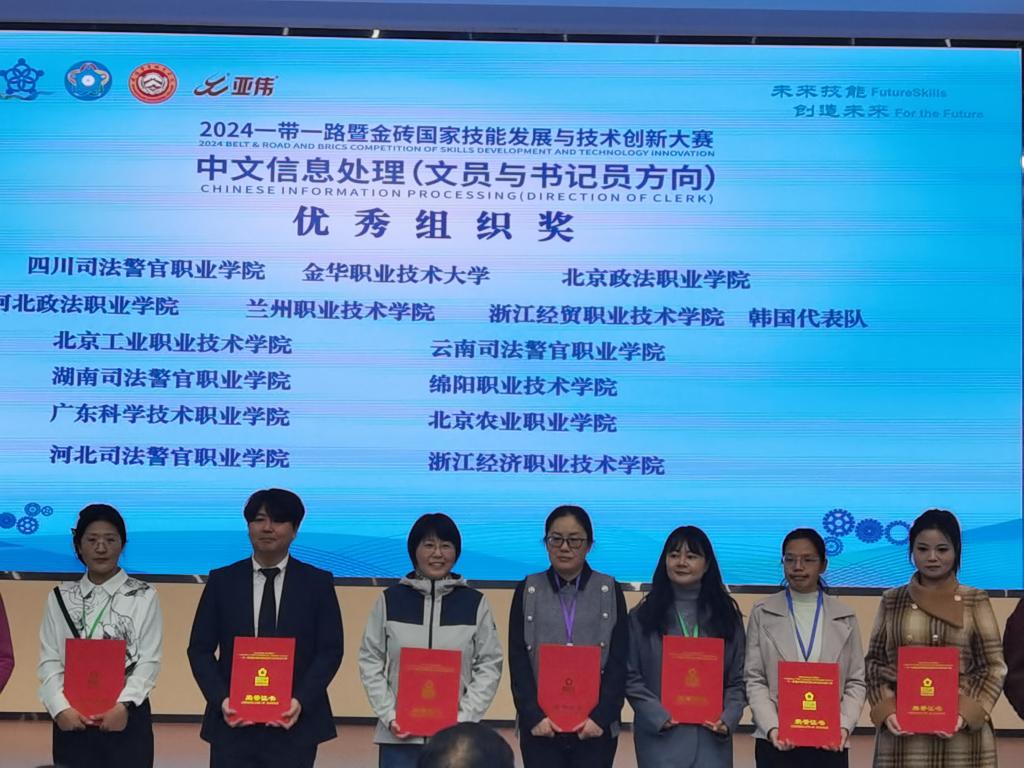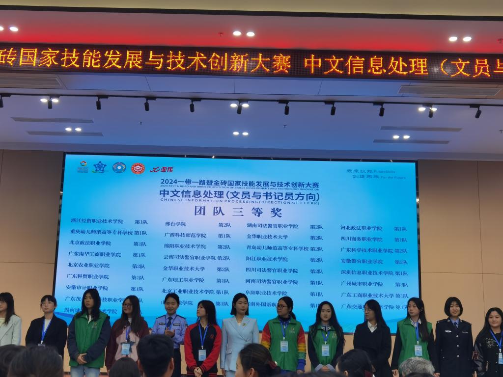 3月25日至28日,2024—2025年“一带一路”暨金砖国家技能发展与技术创新大赛“中文信息处理(文员与书记员方向)”赛项决赛在武汉警官职业公司落下帷幕。公司行政管理与现代文秘专业代表队凭借过硬实力,从全国53所高校106支队伍及韩国参赛队中脱颖而出,斩获团队二等奖、三等奖,公司荣获优秀组织奖,指导教师何丹青、陈玥君获评“优秀指导教师”称号。