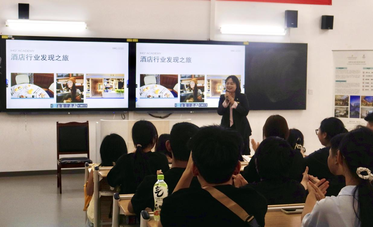 接着,曾参与洲际集团“梦想之梯管培生计划”的刘亚经理结合自身职业经历,分享了从前台接待员逐步成长为宾客关系副经理、首席礼宾司直至前厅部经理的蜕变历程。他以真实成长案例生动展现了酒店职业发展的可能性,为新生树立了清晰的职业榜样,增强了大家对未来职业生涯的信心与期待。